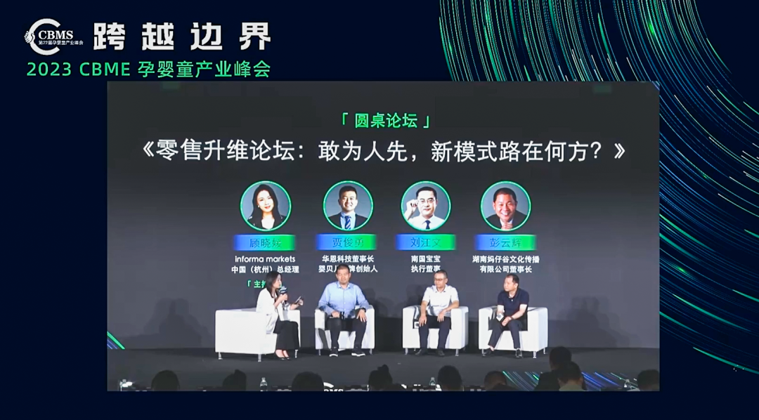 Informa markets中国(杭州)总经理顾晓媛作为主持人与贾俊勇和湖南妈仔谷文化传播有限公司董事长彭云辉、南国宝宝执行董事刘江文,针对《零售升维论坛:敢为人先,新模式路在何方?》这一主题交流互动。