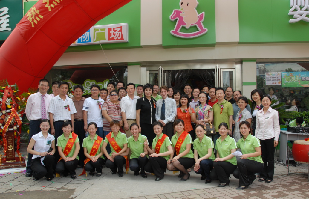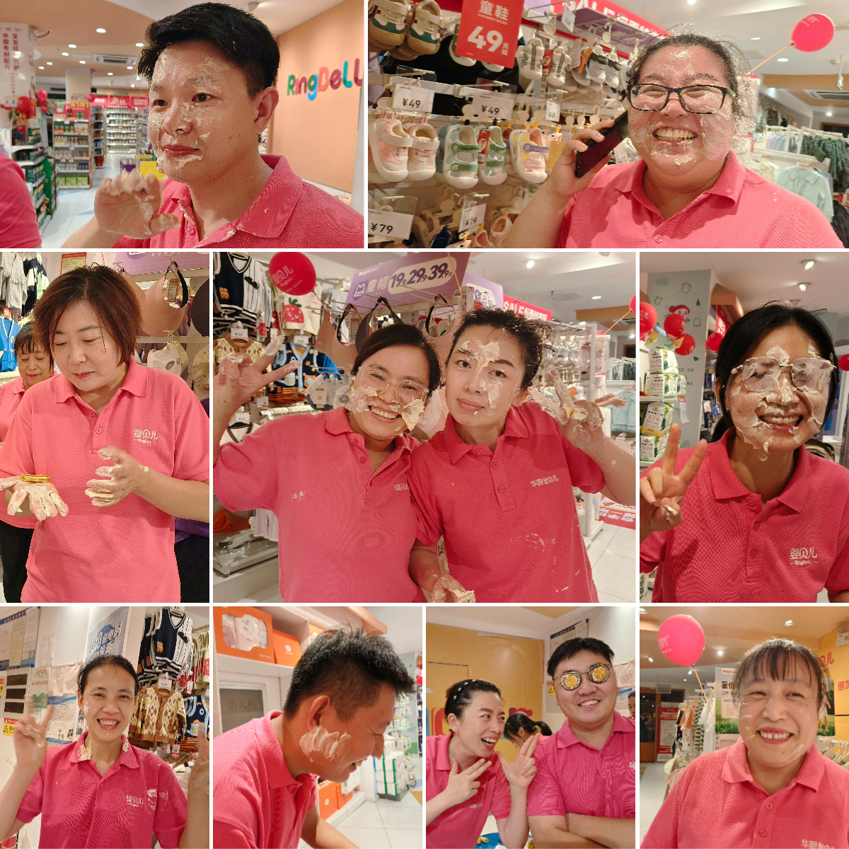 庆典现场,周年庆总指挥杜菲菲、新零售中心负责人付帝斌、商品中心用品部负责人李姣姣、省妇幼区域督导李娜与历山店店长左玉芬带领的团队欢聚一堂。