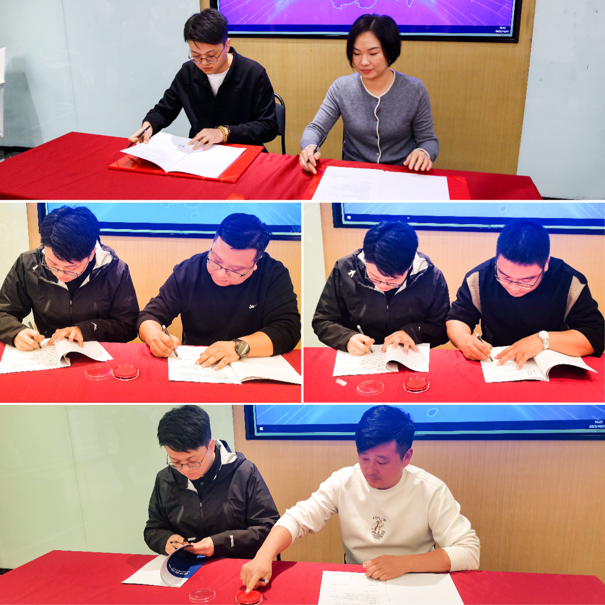 签约仪式上,湖北大区总经理韦康与武汉小悦町老板贺宇兰、枝江爱贝儿老板刘鹏志、宝贝一家亲老板章磊、宜都点点爱老板杨玉共同签署合作文件。