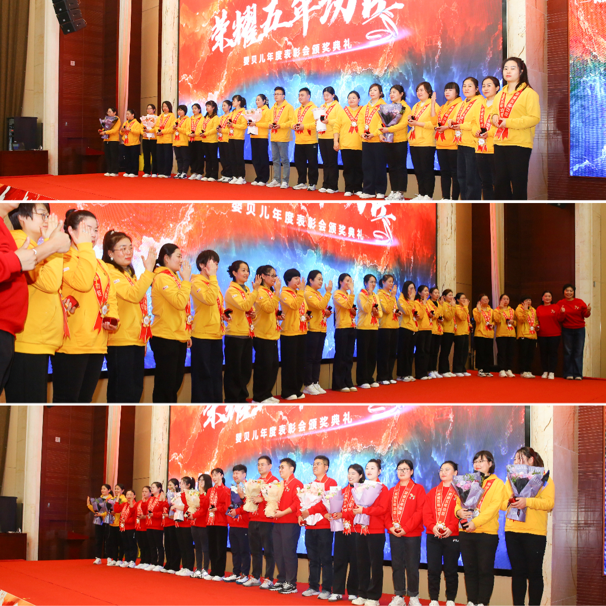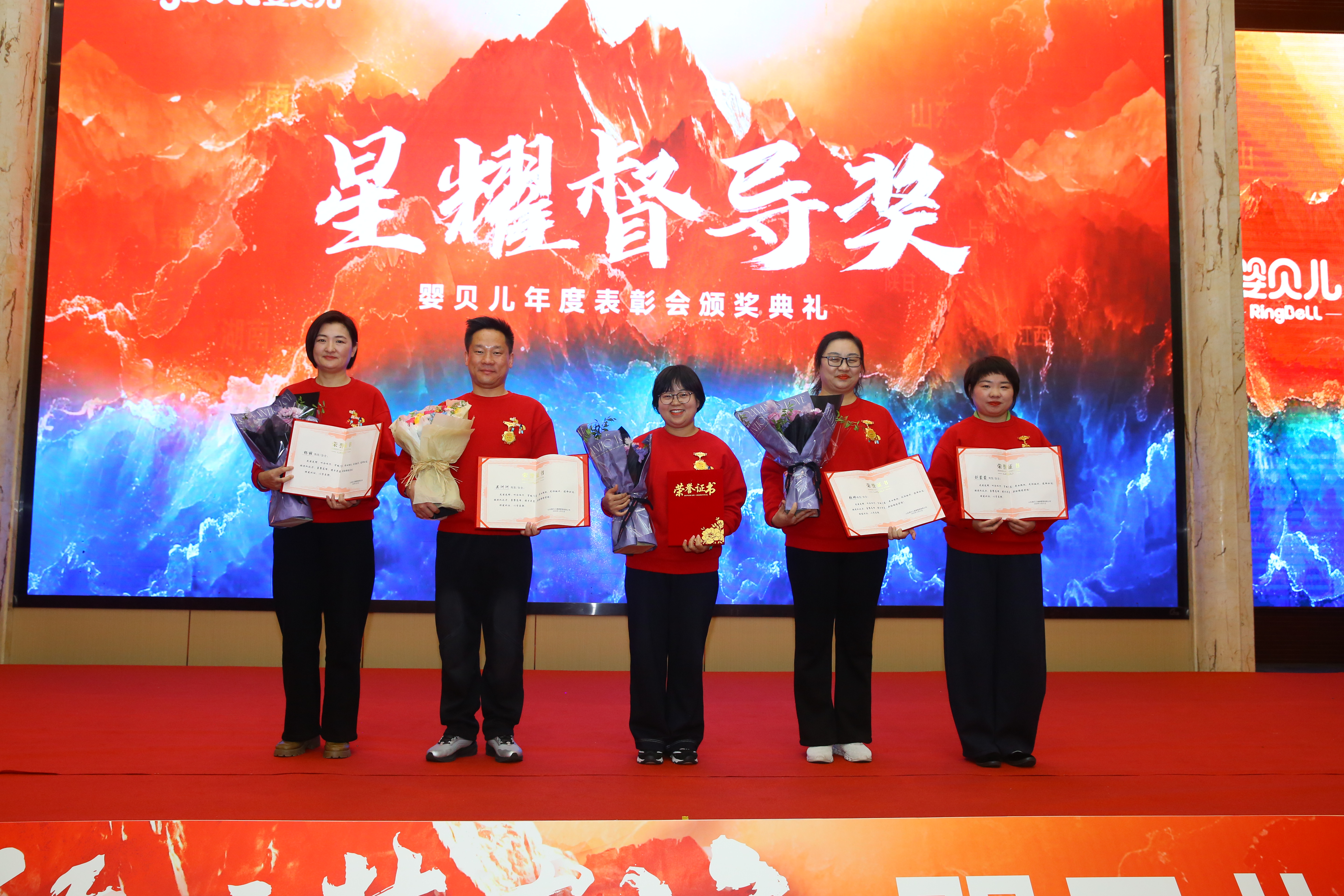获奖者们身着统一红色卫衣,佩戴着荣誉的配饰,手捧证书和奖牌,脸上洋溢着幸福的微笑。
